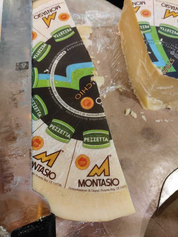 Pastă tare din lapte de vacă, cu coajă spălată și imprimată cu denumirea Montasio. Stravecchio maturată raclată în fulgi subțiri se topește pe limbă și întoarce din palatin o aromă intensă, distinctivă. Merge cel mai bine cu vin roșu corpolent dar duce bine și un vin alb cu aciditate suficient de bună.