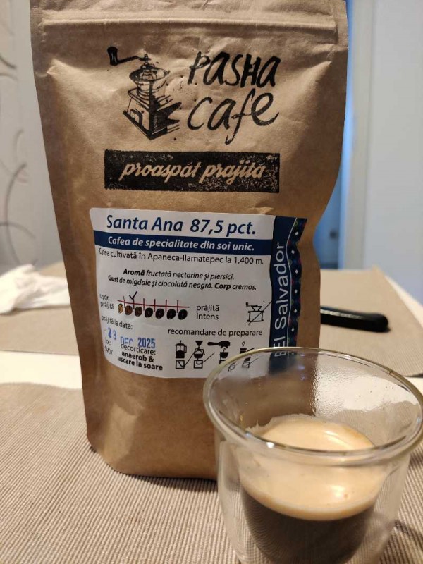 O cafea salvadoriană de calitate, cu note aromatice de piersică 🍑 în 👃 și gust cu iz de ciocolată neagră cu migdale mărunțite fin. Finiș prelung, mătăsos, intens cu iz de tutun. Corp mediu și ușor cremos. Aș spune că merită încercată fără rezerve atât în espresso cât și capucino.